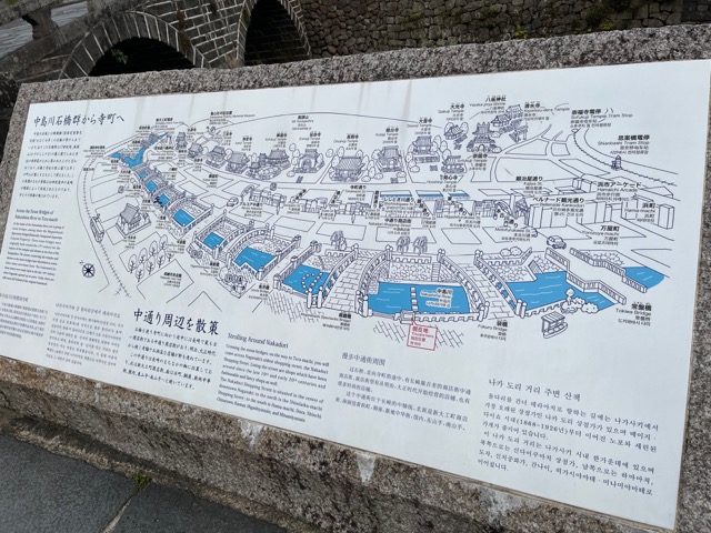 また古くから長崎の中心を流れていた中島川には他にも12の石橋が架けられていて、中島川石橋群と呼ばれています。付近に魚市場があり毎日新鮮な魚が運ばれたという「魚市橋」、昔死刑囚が市中引き回しの際に必ず渡らなければならなかったため、阿弥陀堂が橋の袂に建てられたことに由来する「阿弥陀橋」、河畔にたくさんの桃の木があった「桃渓橋」など、それぞれの橋の名に込められたエピソードを読みながらの散策もまた楽しみものです。