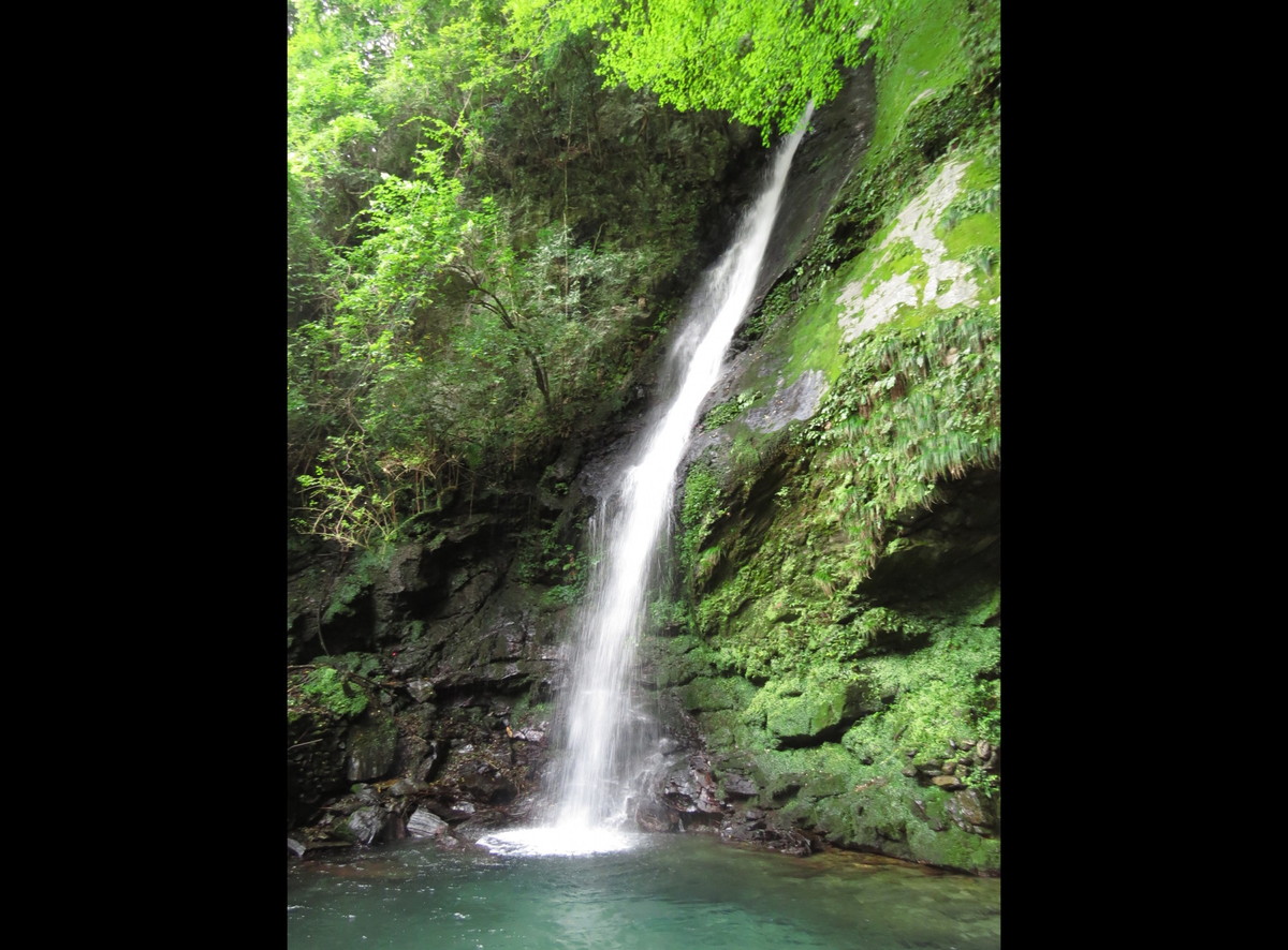 苔むした岩壁と滝壺は緑一色で、一筋の白い滝がコントラストを描く。