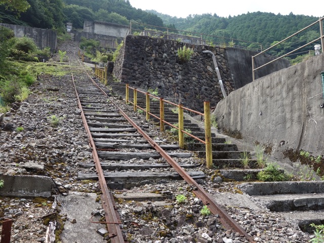 階段状のコンクリート基礎の横にインクラインが残っている。高低差75mを鉱石を積んで行き来した。