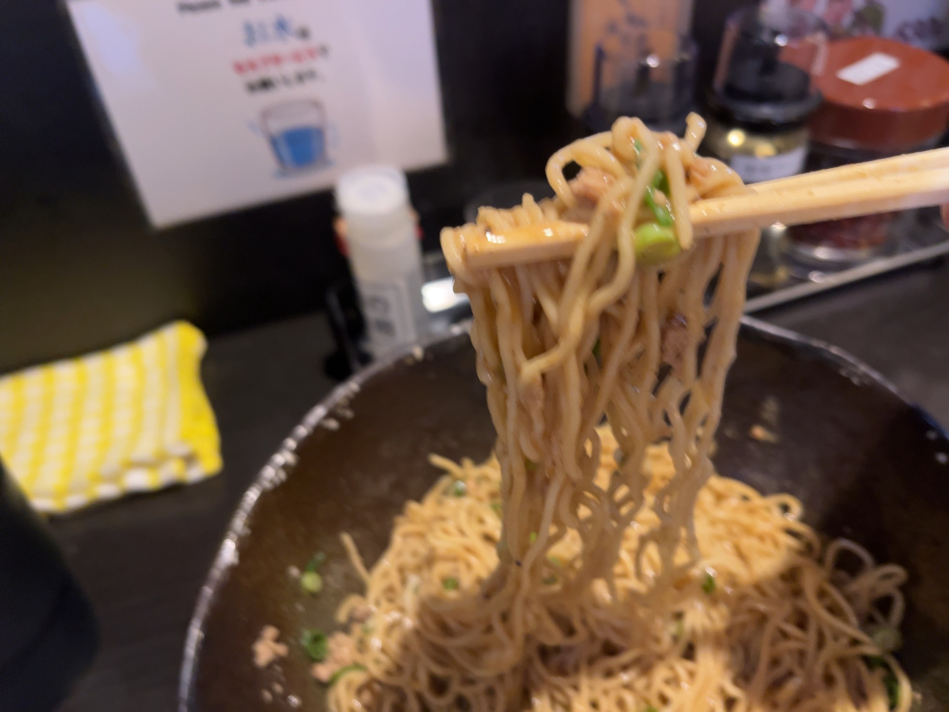 ビル1階の間口の狭い外観。店内は厨房側と壁側に、すべてカウンター席になっています。入口にある食券機の大きなボタン8つ、なんだか押しがいがあります。汁なし担担麺専門のため、並盛か大盛×1辛〜4辛の8種類です。あとは小さなボタンでトッピングのネギ、セロリ、温泉玉子、それに担担ライス用のライスなど。シンプルなメニューです。辛さは2辛がお店のオススメで1番人気。辛いものがやや苦手な私は1辛を選びます。厨房に面したカウンターに座って食券を渡します。すると驚きの早さで提供。1分も経ってないんじゃないでしょうか、駅の立ち食いうどん級の早さに感じました。この早さも、広島汁なし担担麺の特徴です。