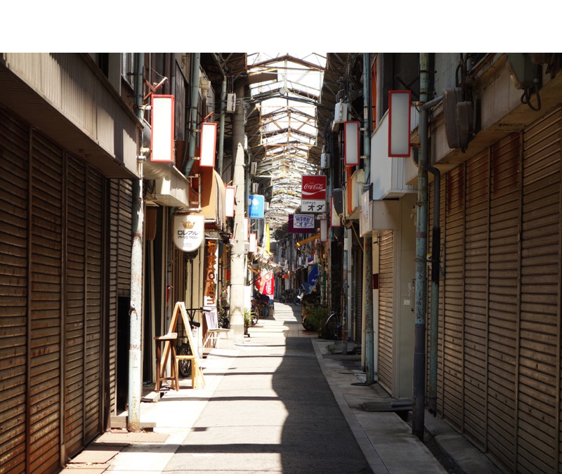 そんな新旧が混ざり合う中津の街において、いまだに最も古めかしい一角が中津商店街です。間口の狭い木造2階建が密集して並び、その真ん中を貫くように真っ直ぐ200mほど。時間が止まったままの雰囲気が逆に魅力で、近年注目を浴び始めた商店街です。阪急中津駅から駅前の公園を抜けてすぐ、昭和の看板職人が作ったであろう赤文字の看板がいきなりレトロ感満載で迎えてくれます。道幅は2mくらいでしょうか、かなり狭く感じます。それこそ路地のよう。一応アーケードがついていますが、よく見ると屋根がありません。雨が降れば濡れる商店街です。土曜日でしたがシャッターを閉めた店舗がほとんどで、裏ぶれた様子がすごくいい感じです。平日はもう少し多くの店舗が営業しているのでしょうか。