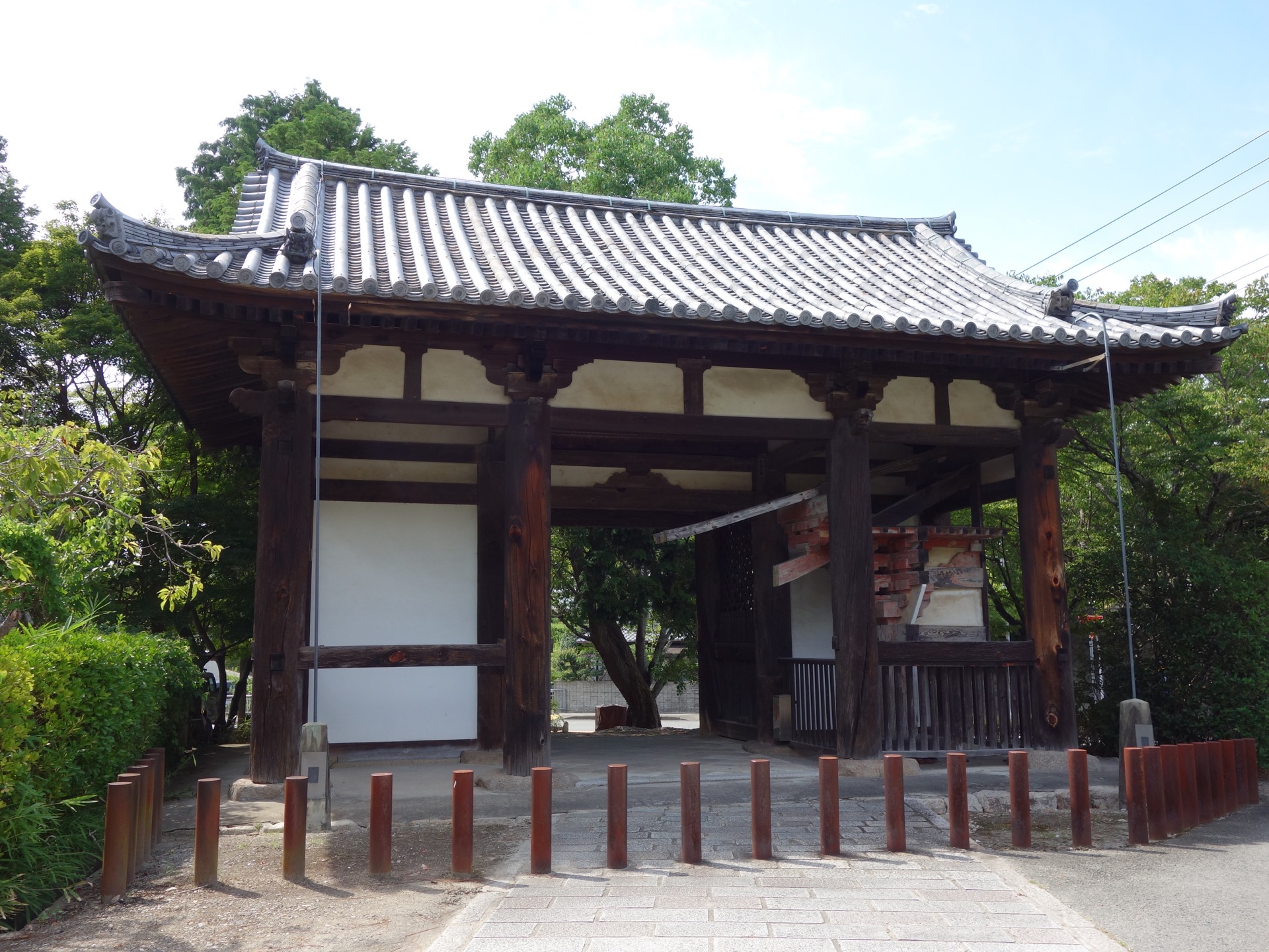 県道を東へ走ると、突然道路脇に古い仁王門が現れます。これが太山寺の山門です。重要文化財に指定されている貴重なもので、室町時代中期の再建です。高さは8mありますが、周囲の木立が生い茂って隠れています。しかしこの場所に移築されるまではさらに上部にもう一層あったそうです。その時の軒下の組み木は、今も仁王門に保存展示されています。そして仁王門の左側は車も通れる道路が続いています。その道を仁王門を越えて進むと、予想もしていなかった太山寺の世界が広がっていました。