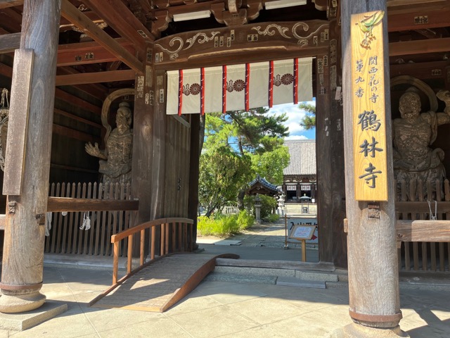 鶴林寺は加古川市の郊外に位置します。とはいえ周りは住宅街で、山並みも遠くにある平地。どうしてこの地が選ばれたのかは分かりませんが、何の変哲もない街中に突然森に囲まれた境内があります。南側に駐車場があり、すぐに山門があります。これは仁王門と呼ばれ、1672年に再建されたもの。屋根が空に対して大きく広がり、迫力がある山門です。十分に時間が染み込んだ古風な雰囲気があり、木造の二体の仁王像を納めています。仁王門をくぐったところに受付があり、入山料を納めて境内へと進みます。