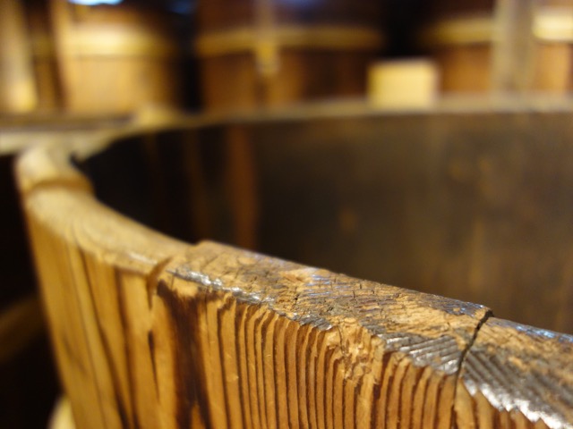 日本酒のもととなる醪(もろみ)を造る工程で使われた、高さ2mにもなる大桶が並ぶ様子は圧巻。