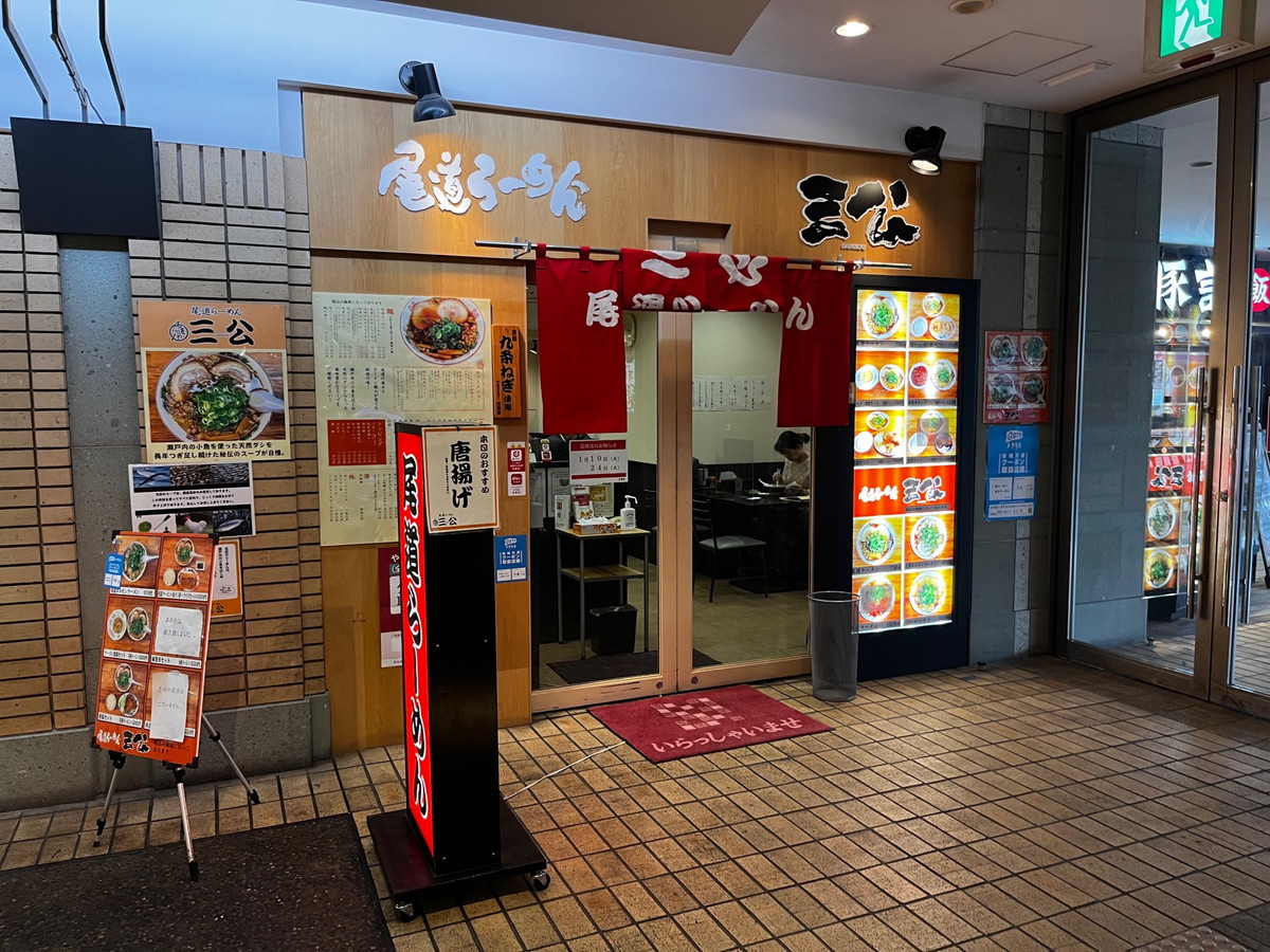 仕事で広島出張を重ねるうち、尾道ラーメンを広島市内で楽しむことを覚えて2軒目。今回は基町の商業ビルに店を構える尾道ラーメン・三公を訪問しました。こちらのお店、かつては広島駅の駅ビルにあったのだそう。だから広島市内で尾道ラーメンといえば三公と言われるほど、ファンも多いお店なのです。広島駅界隈の壮大な再開発計画のための建て替えを機に、2020年に現在の基町クレド内にある商業施設パセーラに移転してきました。地下一階の一番目立つ場所で、赤い暖簾を目印に営業しています。
