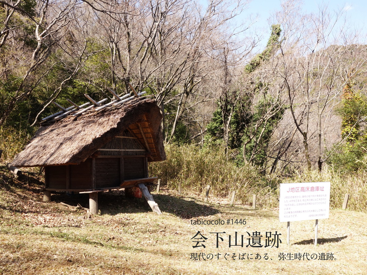 会下山遺跡では複数の竪穴式住居跡や祭りなどが行われた祭祀場、火を焚いた場所、倉庫、ごみ捨て場、堀などが見つかっています。そのどれも保存状態がかなり良かったらしく、今もくっきりと集落の構成を見てとれます。だいたいは柵で囲われたことでその痕跡が分かりますが、とくに住居跡は円形で視認しやすいですし、ひとつひとつに丁寧な説明板があり分かりやすいです。また尾根伝いに住居跡が並ぶ中、少し下がった場所に高床式倉庫が一棟、再現されています。そんなものを見て歩いていると、ここには確かに人々が暮らしていて、「ムラ」のような結びつきがあったことを肌で感じられます。それは登呂遺跡では感じられなかった、よりリアリティのある感覚です。それがこんな身近にあるなんて、もっと知られてもいいのになと思うのでした。