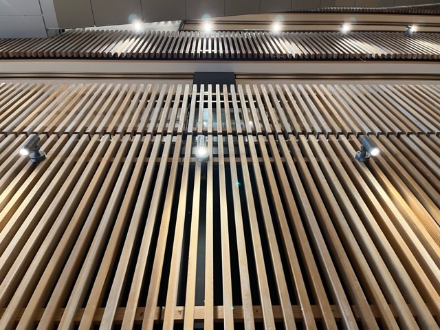 館内は中央に4層の吹抜け空間があり、その空間を囲む壁面は紀州産の無垢木材を使った縦格子で仕上げられている。
