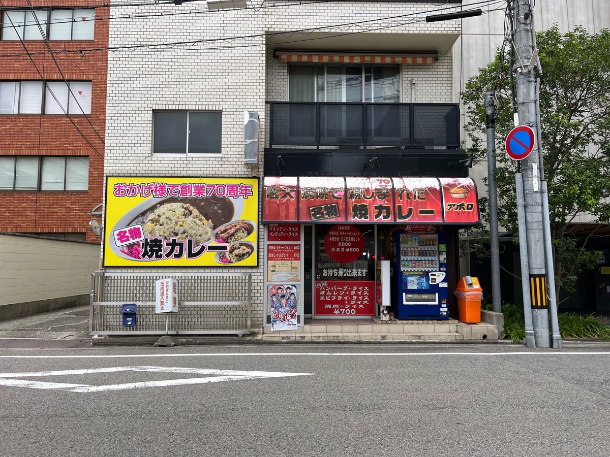 数年前にたまたま店の前を通り過ぎて以来、ずっと気になっていた謎のメニュー「名物焼カレー」。店先には大きな看板があって堂々と掲げられているその文字がインパクトありすぎて、和歌山ラーメン巡りをしながらもずっと気になっていたお店でした。その店の名はアポロ。和歌山城の北側、市役所など官公庁が建ち並ぶ一角にあるお店です。