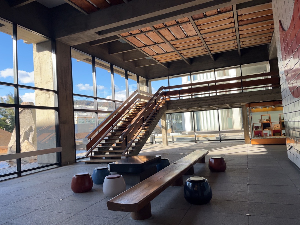 建物内部も、凄まじいほどに見ごたえがあります。まず目に入るのは一階中央にある巨大な陶板壁画「和敬清寂」。香川県出身の著名洋画家・猪熊弦一郎による作品です。圧倒的な存在感で空間にそびえ、支配しています。