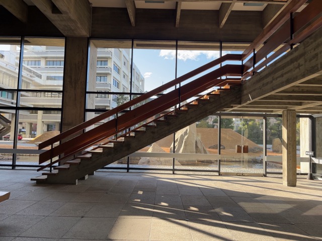 また正面入口手前のピロティが秀逸。コンクリート打ちっ放しで天井の高さは約7mもあり、開放的な空間になっています。天井は高松産の木材を使ったルーバーで化粧されていて、コンクリートの無機質な感じが一切しません。またピロティの床も高松沖の海底から採取した玉石や小豆島の花崗岩を用いた敷石が使われていて、地産材を活かした建築の先駆けと言っていいかもしれません。そしてこの空間には、モダンな近代建築であるにもかかわらず、とても優しく豊かな表情が醸し出されているのです。さらに何かの象徴のように上階から降りてくる階段、盃のような石のベンチ。それはまさに芸術を見るようです。
