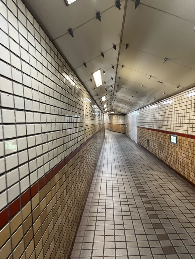 地下道は幅約2mと狭く、天井もそれほど高くありません。長さは80mほどで、真ん中あたりにセキュリティのためか、警備員がいます。ひっそりとした街の片隅にある秘密のトンネル。そんな言葉がピッタリの、地下基地のような雰囲気。壁のタイルなんかもいい感じにレトロで、そんなところも魅力的です。