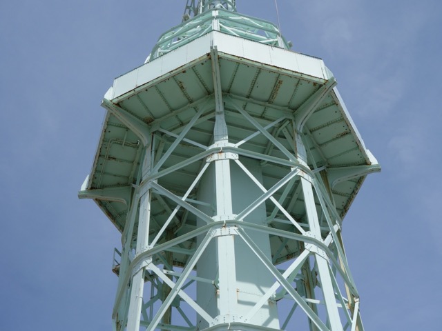 塔の形状としては八角形で、基壇部は石造りのどっしりしたもの。上部は薄いグリーンの塗装がされた鉄骨の構造体で、頂部はドームのような形状になり、その上に船のマストのような尖塔が付いています。鉄骨の塔身の中心には太い柱があるのですが、実はこの中に手動のエレベーターが仕込まれているそさのだそう。中が見たくて仕方ないですが、内部は非公開となっています。