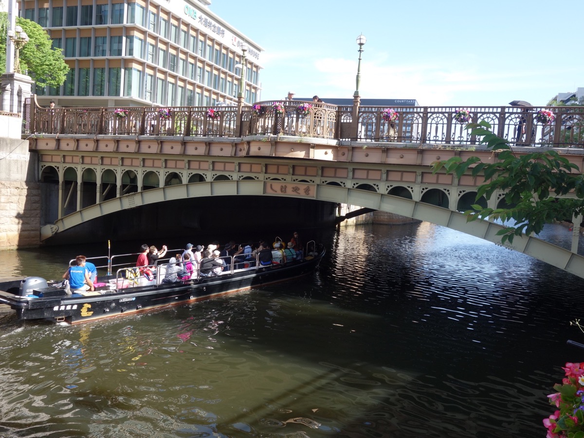 橋の袂から、堀川沿いの遊歩道へ降りることができます。納屋橋を下から見上げられる、絶好の撮影スポット。橋桁の下も凝った意匠で見ごたえがあります。橋の北側からも、南側からも、遊歩道で眺めることができます。夏日の5月。散策も少し汗ばむ陽気でしたが、遊歩道は日陰になっていて心地よく、しばらく納屋橋を眺めながらひと休みしていました。すると音も立てずに堀川をやってきた遊覧船が、納屋橋の下をくぐり抜けて進んでゆきました。