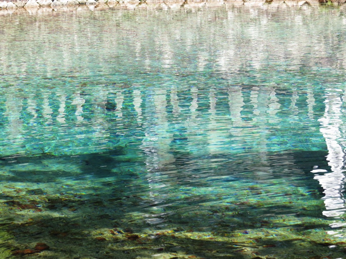 淡いブルーグリーンで日光に煌めく様子はさながら宝石のよう。水汲み場もあり、この美しい水を飲むこともできる。
