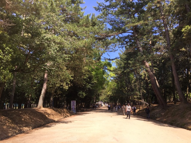 周囲にはたくさんの鹿たちが思い思いの時間を過ごし、このあたりのゆっくりとした時間の合間を漂っています。参道沿いには自然があふれ、歩き進むにつれて木々の緑は濃く深くなってゆきます。やがて鬱蒼とした杉の立ち並ぶ、ほの暗い森の中の道となり、あたりは厳かな雰囲気に包まれます。道脇には苔むした石灯籠が整然と並び、その間からチラチラと毛並みのよい鹿が顔を出す光景は、奈良の神髄を見ているような気がします。