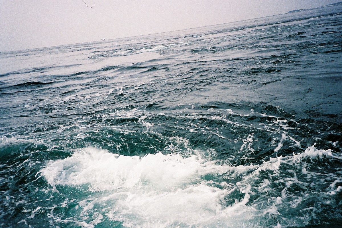 そこでは潮の満干と複雑な地形の影響で、一部分の海水が川のように流れています。流れない部分もあり、その境界線で渦潮が発生します。船はまさにその境界線上でホバリングするので、デッキからすぐそこに、大きな音を立ててとぐろを巻く渦潮が見られます。この日は大潮ではなく、やや小振りな渦潮でしたが、それでも迫力満点。渦を巻いては消え、また現れるめまぐるしい海面が間近に迫ります。最大で直径20mにもなるという渦潮が見れたら、どんな迫力なんだろうと、想像せずにはいられませんでした。