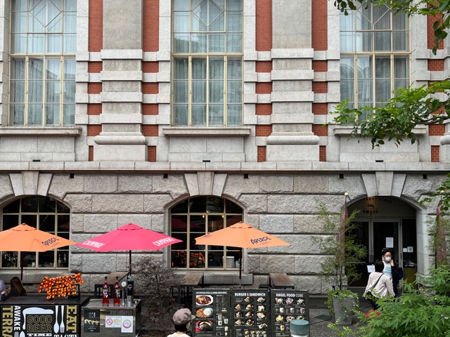 淡い水彩画のような雨が止み、吸い込まれそうな青空にとって変わったその日は、夏に向けて勢いを増した緑が美しく、赤煉瓦を纏った建物とのコントラストが鮮やかでした。見上げると澄んだ空に建物の輪郭がエッジを効かせ、張り付いたようにパリッと映えて見えました。屋上にある青銅のドームはいよいよその存在感を増し、青い空を支えているように大きく見えます。