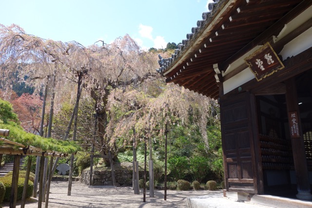 しばらく桜に見惚れたあとは、さらに境内の上を目指します。すると次の釈迦堂の前にはまたもや巨大な枝垂れ桜。釈迦堂を借景に、はたまた大きな青空を借景に映える姿もさることながら、桜自身の見事なまでの満開ぶりには感銘を受けます。