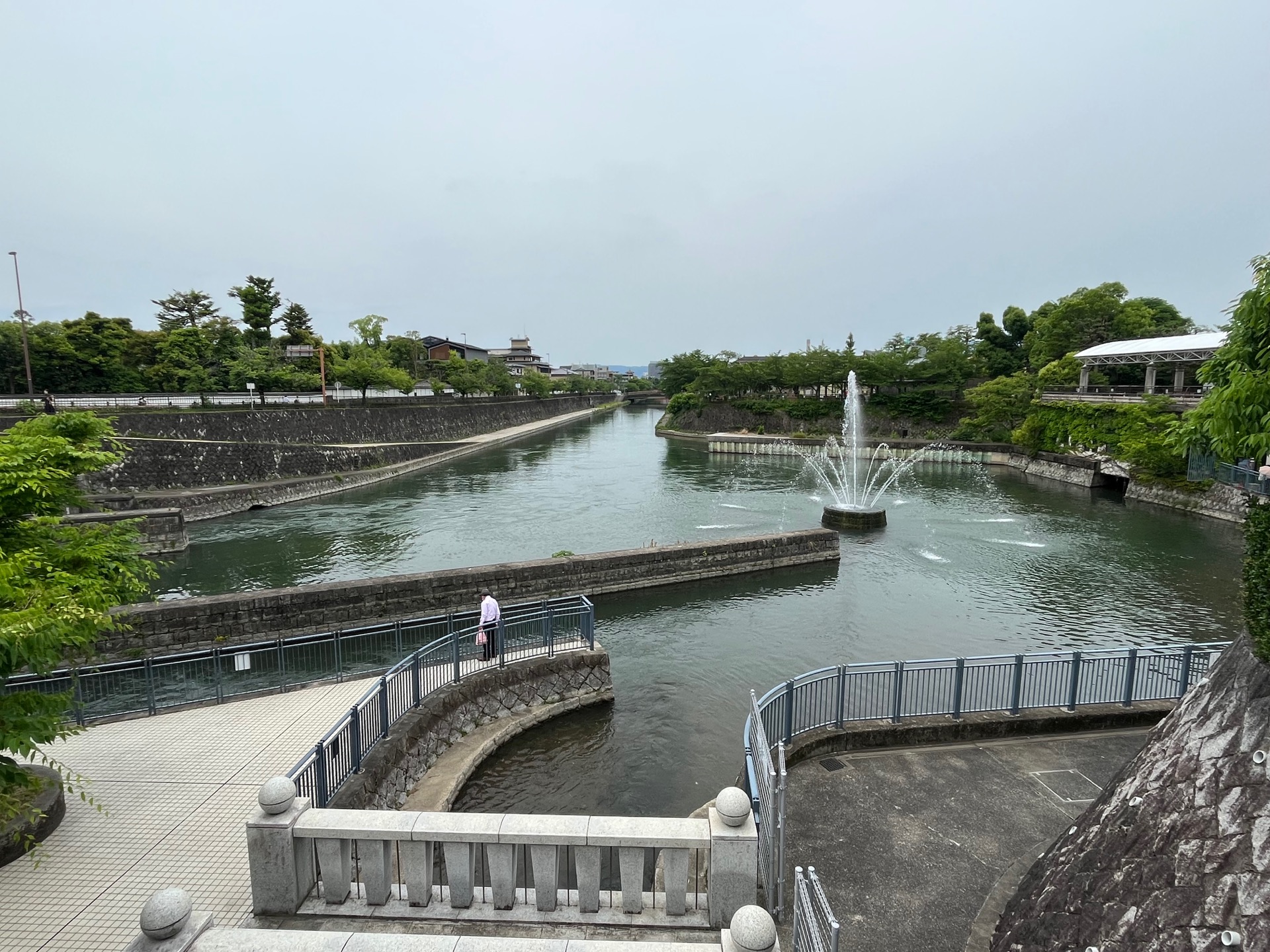 そして個人的に最も印象に残ったのが、記念館の西側にある屋外のテラスです。そこから見下ろす南禅寺船溜の風景が、なんとも絶景なのです。南禅寺船溜は蹴上インクラインの脇を流れてきた疏水、蹴上発電所を通って流れてきた疏水、また疏水分線という南禅寺水路閣方面に向かう水路から一部放水された疏水が3方から合流する、直径50mくらいの池みたいな場所です。昔はそこでインクラインで琵琶湖方面に水揚げされる船が順番待ちをしていた、地上で言えばバスロータリーみたいな施設。疏水の高低差を利用した噴水があり、独特の雰囲気がある空間になっています。豊富な水が集まり、ひとつになってここから西へ向かっていきます。この先は鴨川まで西進し、鴨川の横を並行に南下していきます。鴨川から逸れて向かう伏見では昔の伏見桃山城の外濠だったところを流れ、やがて宇治川まで注ぎます。