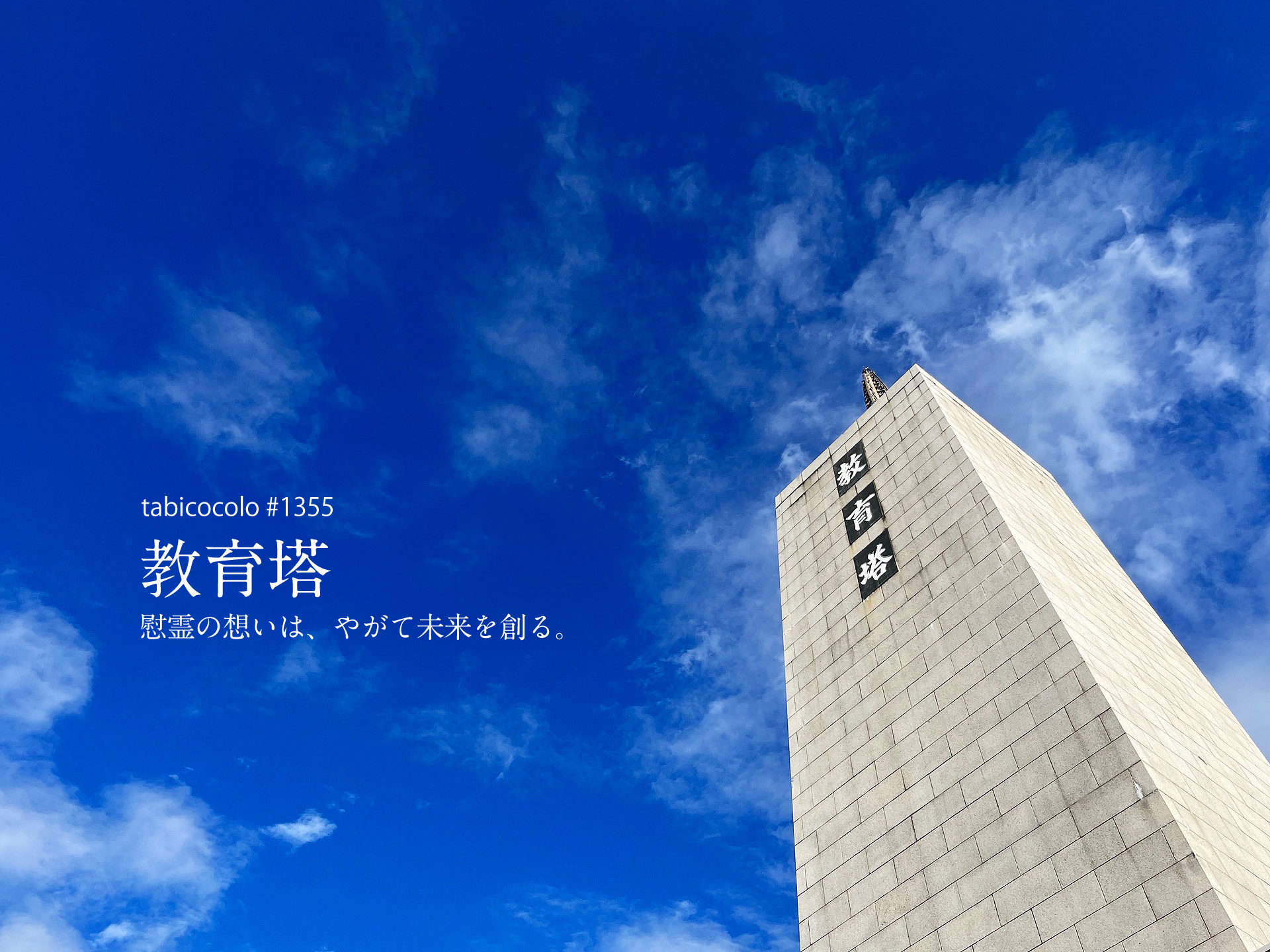 青空を背景にして教育塔の白さが際立つ。