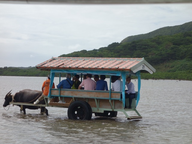 由布島への往復を水牛車で。雄と雌では力が違うため、引っ張る車の大きさが違うのだそう。