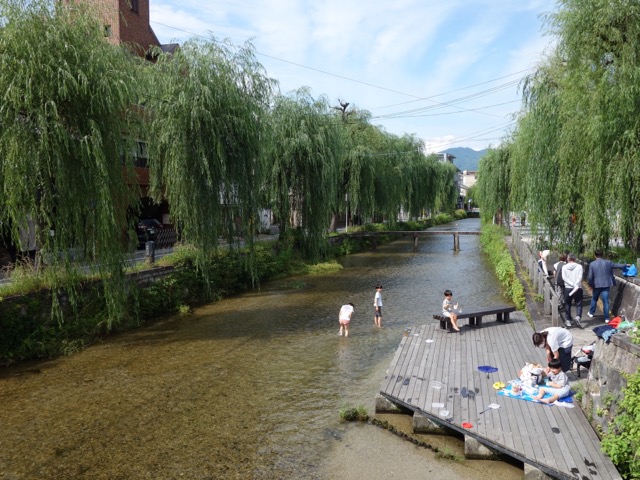 一本橋は古川町橋、行者橋、阿闍梨橋とも呼ばれますが、地元ではもっぱら白川の一本橋として親しまれてきました。訪れた時にもすぐ下流にある親水テラスでは地元の子供たちが集まって水遊び。初回の昼下がり、水深もごく浅い白川は絶好の遊び場になるのです。