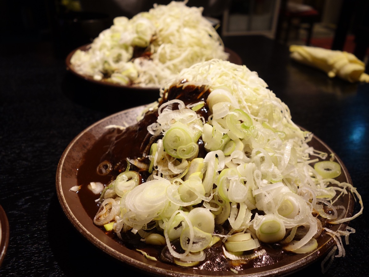 名古屋の味噌カツ、お店によって色々とある特徴の幅がわりと大きいですが、この店の味噌カツの特徴はかなり個性的。「味噌カツ定食・大」を注文したのですが、なんと主役のカツが見えていません。驚くほど大量のキャベツと大量のネギによって、覆い隠されているのです。思っている以上のネギをどけて、やっと登場する味噌カツ。たっぷりの味噌ダレを纏って、けっこうなボリュームがあります。