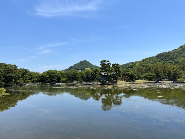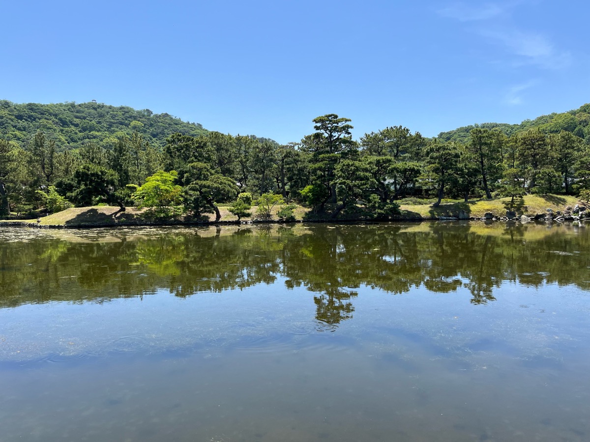 養翠園は回遊式で、あらかじめ決められた順路で見学します。まず目に飛び込んでくるのが前述した、汐入式の池です。池だけで約3,500坪もあるという広大なもので、畔に立てば景色のうちほとんどを池が占めるほど。でもその水面は鏡のように静かで、池を取り巻く世界をそのままに映しています。池の周りには立派な松を中心とした木々が立ち、その向こうにある章魚頭姿山(高津子山)と天神山を借景とした絶景が広がります。そしてそれらが映り込んだ池には、小さな島と水面を横切る土堤も見えます。真っ青な五月晴れの空もしっかり水の中に見え、本当に美しい景観です。